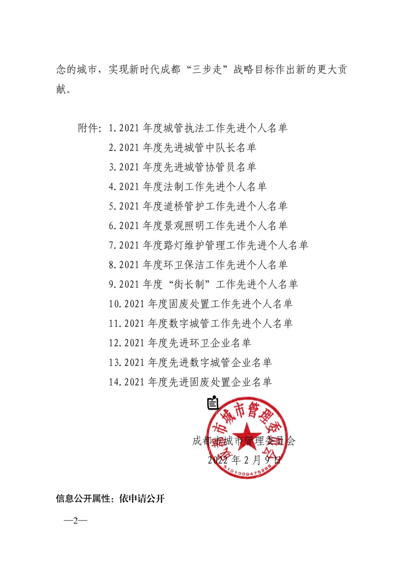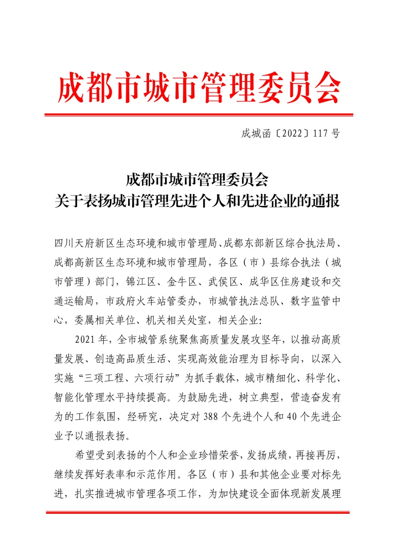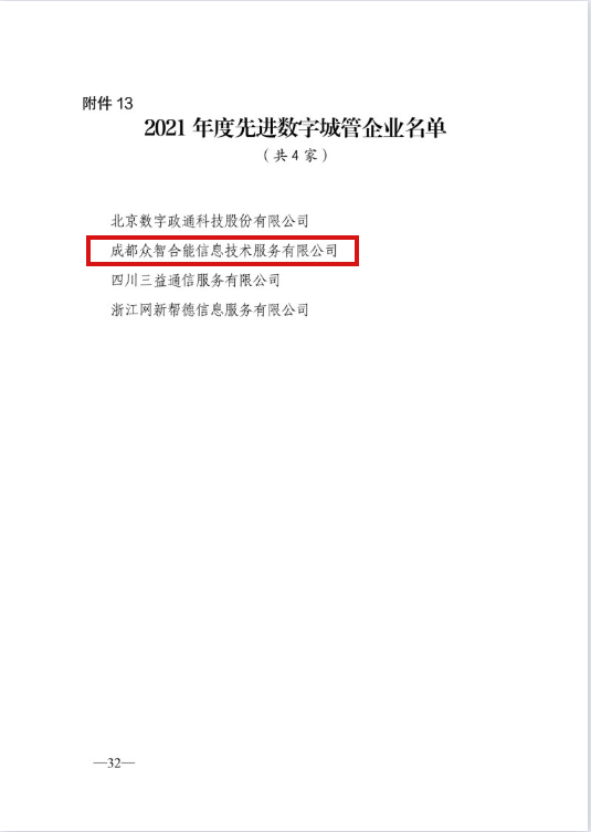 熱烈祝賀眾智合能被成都市城市管理委員會(huì )評為“2021年先進(jìn)數字城管企業(yè)”。