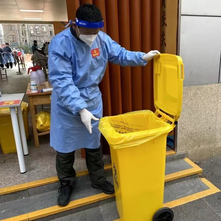 采集員顧磊在防疫巡查工作中,檢查防疫垃圾桶,對不符合要求的現場(chǎng)提醒,并登記上報。